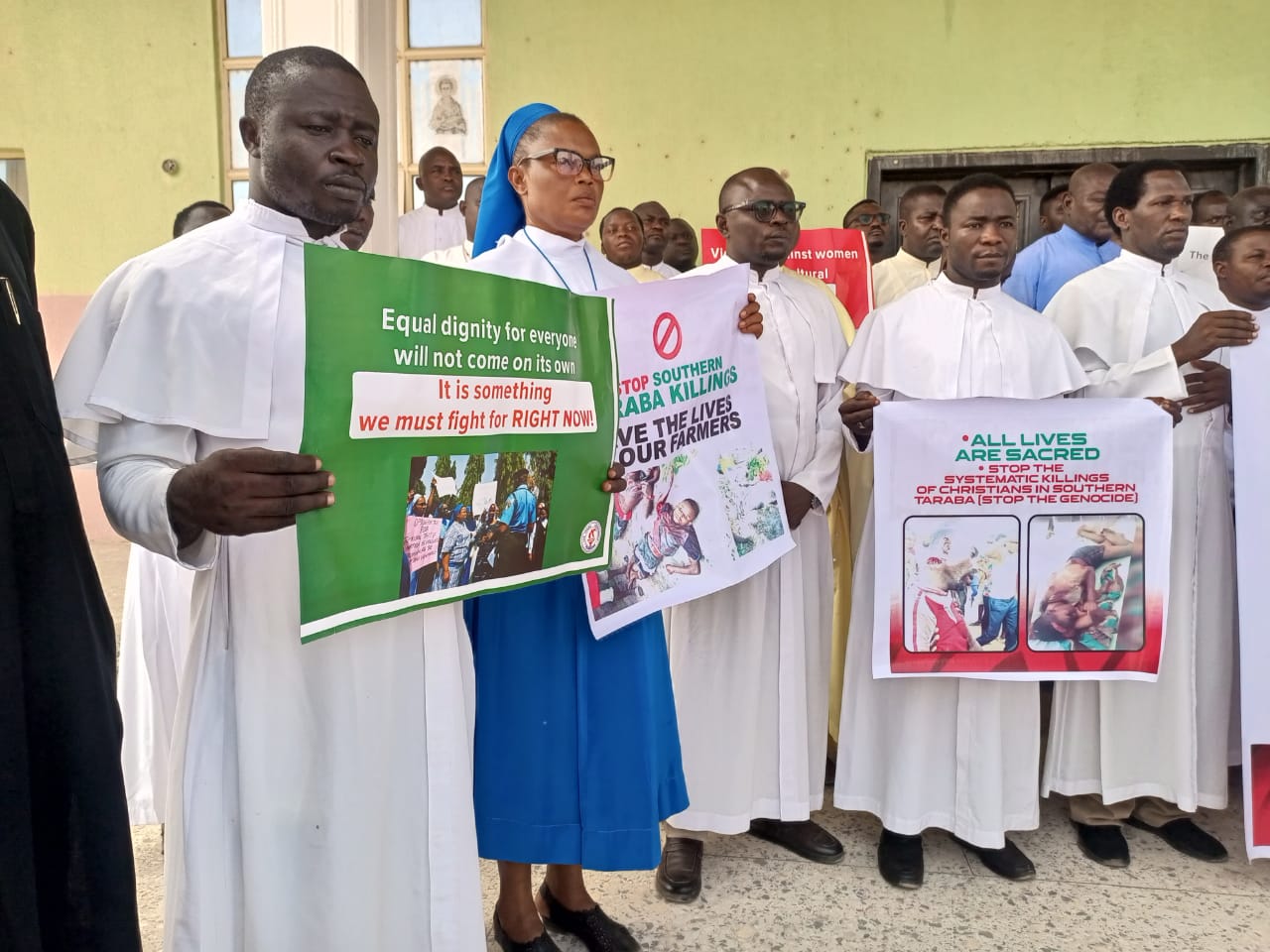 Priests, and other faithfuls from the Catholic Church Dioceses of Wukari and Jalingo have staged a peaceful protest against continued communal clashes that have left many residents dead in parts of Takum, Donga and Ussa Local Government Areas of Taraba State.