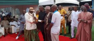 The Obaloye of Warri Kingdom presenting one of the cheques to a beneficiary on behalf of Chief Ereyitomi