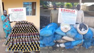 “At the Seme border area of Lagos, NDLEA operatives on Wednesday 22nd October nabbed Jacob Ojugbele with 55kg skunk at Ashipa area of Badagry while Amusa Oluwabukola was arrested with 121.3 litres of skuchies at Itoga Badagry.