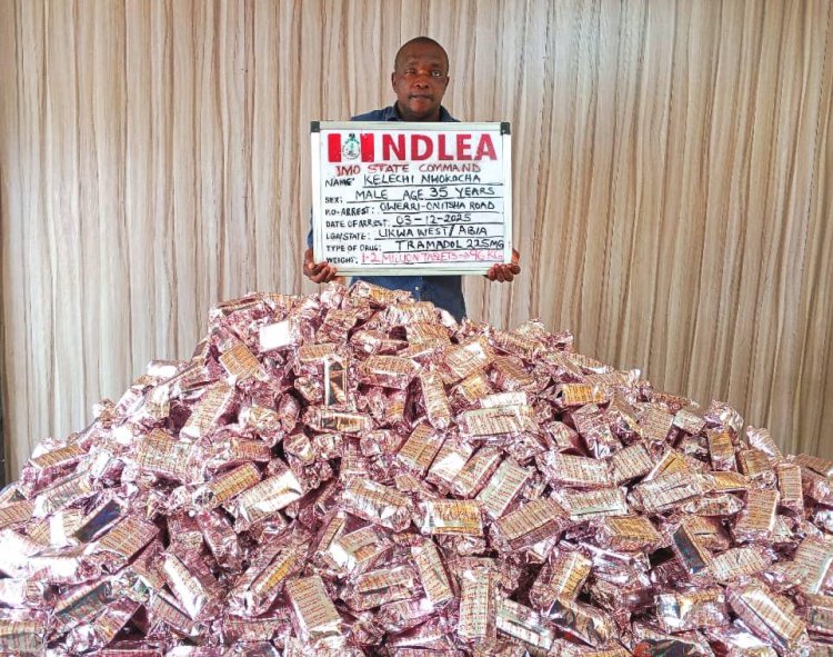 “No fewer than 1.2 million tablets of tramadol 225mg were seized from a suspect Kelechi Nwakocha, 35, on Wednesday, 3rd December when NDLEA operatives on patrol at Orogwe, along Onitsha- Owerri road Imo state, intercepted his vehicle conveying the consignment which was loaded at Aba, Abia State, heading to Onitsha, Anambra State.