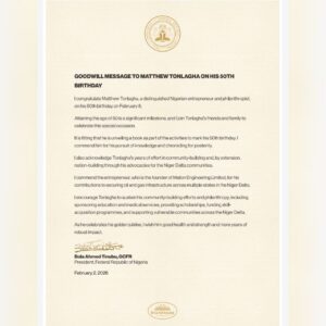 President Bola Ahmed Tinubu has congratulated Matthew Tonlagha, a renowned Nigerian entrepreneur and philanthropist, on his 50th birthday coming up on February 8, 2026.
